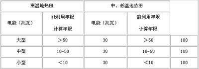根據(jù)地?zé)峥辈閲覙藴蔊B11615─89規(guī)定,地?zé)豳Y源按溫度分為高溫、中溫、低溫三級,按地?zé)崽镆?guī)模分為大、中、小三類(見表4-2、4-3)。