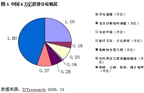 4萬億方案具體構成是,近一半投資將用于鐵路、公路、機場和城鄉電網建設,總額1.8萬億元;用于地震重災區的恢復重建投資1萬億元;用于農村民生工程和農村基礎設施3700億元;生態環境3500億元,保障性安居工程2800億元,自主創新結構調整1600億元,醫療衛生和文化教育事業400億元。從政府投資受益的行業主要包括水泥、電網設備、機械、鐵路、環保。此外還有受3G牌照發放等政策催化下受益的通訊設備行業。