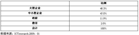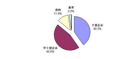 將中國IT應用市場垂直劃分為:大型企業(yè)市場、中小型企業(yè)市場、政府市場、教育市場和家庭市場五種類型。其中前面兩種企業(yè)市場屬商用市場,又可平行劃分為銀行、保險、證券、電信、郵政、交通、電力、石油石化、煤炭與其它能源、物流、流通、制造、建筑、科研、媒體、衛(wèi)生等行業(yè)應用市場(平行市場);后面三種(包括政府、教育、家庭市場)屬于非商用市場。