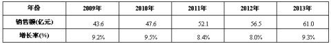 表8 2009-2013年中國通信電源市場市場銷售額預測