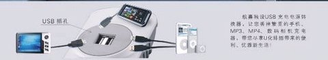 世界知名電源服務商航嘉研發設計的帶有USB充電接口的電源轉換器,實現對手機、MP3、MP4、數碼相機等的充電功能。全新的設計理念徹底突破了國內原有電源轉換器在使用性能上的概念應用,在根本上實現了技術上的突破,這種集成式的信息功能代表了第二代電源轉器的最根本特點,勢必引起電源轉換器市場新一輪的“變革”。