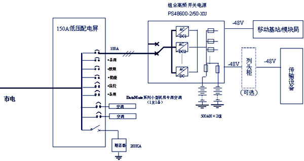 傳輸、接入網類局站通常規模較小、重要程度也較前兩類低,電源系統的要求不可用度不大于 5×10-6,即平均20年時間內,每個電源系統故障的累計時間應不大于50分鐘。 對于此類局站,由于功能單一、規模小,通信和動力設備一般都置于同一房間,其動力配置在網絡能源一體化的解決方案中是規模最小、配置最簡單的一種。如圖可見,此類局站一般僅為一路市電輸入,也不配置油機,只經過一級低壓配電便分配到電源及空調設備,電池的配置也是采用容量一分為二的方式。但是由于機房空間有限,對電源系統的體積、重量、安裝形式會有特殊的需要。有些需要將蓄電池集成到電源系統機架內;有些需要靠墻放置;甚至可能需要壁掛式安裝。此外,此類局站一般不必進行無功補償。