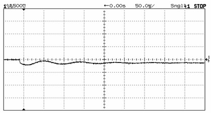以下是系統(tǒng)所采用的模塊,負(fù)載從25%到75%的階越響應(yīng)曲線,從該曲線可以看出,輸出電壓根本就沒(méi)有沖出穩(wěn)態(tài)誤差帶,即動(dòng)態(tài)響應(yīng)時(shí)間為0,這是由于該模塊采用了特殊的控制結(jié)構(gòu),應(yīng)該說(shuō)不可能再有其他電源會(huì)超越這一結(jié)果了。下圖中,縱向每格為500mV,橫向時(shí)每格為50uS。