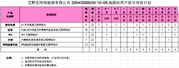 艾默生網絡能源有限公司2004/2005(04.10-05.9)國內用戶培訓開班計劃(圖)