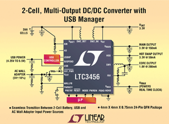 凌特公司(Linear Technology)推出完整的電源管理系統(tǒng)集成電路 LTC3456,該器件專為由兩節(jié)堿性/鎳鎘/鎳氫金屬電池、USB 或墻上適配器供電的便攜式應(yīng)用而優(yōu)化。LTC3456 可向固定 3.3V 主輸出提供高達(dá) 150mA 電流,以及向一個(gè)可調(diào)(VBATT 到 0.8V)內(nèi)核輸出提供高達(dá) 200mA 電流以為微處理器、微控制器和其外部設(shè)備電路供電。此外,LTC3456 能夠?yàn)殚W存卡和永遠(yuǎn)有效的 VMAX 提供一個(gè) 3.3V/50mA 熱插拔 (Hot SwapTM) 輸出,以向?qū)崟r(shí)時(shí)鐘供電。LTC3456 采用纖巧扁平(4mm x 4mm x 0.75mm)24 引腳 QFN 封裝,非常適用于空間敏感封裝的便攜產(chǎn)品。