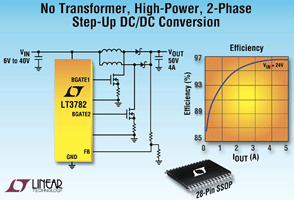 凌特公司(Linear Technology)推出兩相工作升壓型 DC/DC 控制器 LT3782。該器件僅通過兩個電感器,即可提供高輸出功率,而無需功率和電流檢測變壓器。LT3782 可用 10V 至 36V 的輸入電源,并以高達(dá) 96% 的效率在 4A 負(fù)載電流的情況下提供 50V 穩(wěn)壓輸出。兩相工作最大限度地降低了輸入和輸出紋波電流以及所需輸入和輸出電容器的電容值。在 10V 柵極驅(qū)動電壓和 4A 峰值驅(qū)動電流時,LT3782 能以高效率驅(qū)動工業(yè)級大功率 MOSFET。此外,通過可調(diào)的斜率補償、時延和欠壓閉鎖以及同步工作和時鐘同步,電源設(shè)計師能夠定制電路以獲得最佳性能。LT3782 適用于要求升壓 DC/DC 轉(zhuǎn)換器必須以低熱耗散提供大功率并占用較小空間的應(yīng)用,這包括汽車、航空電子設(shè)備、電信和基站等領(lǐng)域。