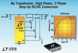 凌特公司(Linear Technology Cor.)推出一款兩相升壓型DC/DC控制器——LT3782。該器件通過兩個電感器,即可提供高輸出功率,而無需功率和電流檢測變壓器。LT3782適用于要求升壓DC/DC轉換器必須以低熱耗散提供大功率,并且占用較小空間的應用,包括汽車、航空電子設備、電信和基站等領域。