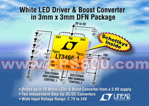 凌特公司日前推出雙升壓型DC/DC轉換器LT3466-1,它是采用扁平3mm×3mm DFN封裝的白光LED驅動器和升壓型轉換器。