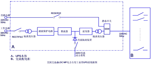 包括: 輸入隔離變壓器、輸出隔離變壓器、整流器、逆變器、靜態旁路開關、手動維修開關、直流隔離二極管、控制單元、顯示單元等