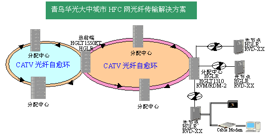 對(duì)于大中城市,由于人口居住集中,對(duì)數(shù)據(jù)通信的要求也比縣城高,所以在城區(qū)的HFC網(wǎng)采用一級(jí)環(huán)形、二級(jí)星形的拓?fù)浣Y(jié)構(gòu)。由于城市市區(qū)面積較大,為保證電視信號(hào)的傳輸質(zhì)量,可以將城區(qū)劃分為幾個(gè)分配中心,分配中心根據(jù)地理位置組成環(huán)形結(jié)構(gòu),每個(gè)分配中心均設(shè)在人口密集,住戶集中的地帶,覆蓋約2、3千戶。在環(huán)上,發(fā)射端下行光發(fā)射機(jī)采用HGLT1550ET(必要時(shí)加HGFA放大器)沿順時(shí)針、逆時(shí)針?lè)较蛲瑫r(shí)發(fā)送同一光信號(hào),采用發(fā)端并發(fā)、收端用光開(kāi)關(guān)切換的工作方式,使環(huán)路具備雙向的自愈能力。