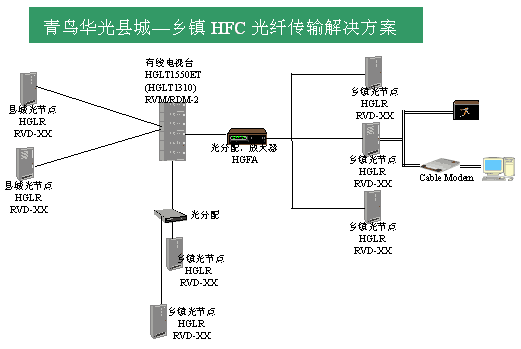 在較小的縣城中,HFC光纖傳輸組網(wǎng)可選用星樹(shù)形混合組網(wǎng)方式。對(duì)于距離近的光節(jié)點(diǎn)可采用HGLT1310系列光發(fā)射機(jī)方式傳送下行信號(hào),對(duì)于距離遠(yuǎn)的光節(jié)點(diǎn)采用HGLT1550ET和HGFA放大器結(jié)合的方式傳送下行信號(hào)。接收端全部采用HGLR1310、1550通用型光接收機(jī)。對(duì)于需要圖像、數(shù)據(jù)回傳的光節(jié)點(diǎn)采用RVD-XX光回傳發(fā)射機(jī),在縣城有線電視臺(tái)用RVM-2或RDM-2回傳接收機(jī)接收回傳信號(hào)。這樣就組成了一個(gè)經(jīng)濟(jì)實(shí)用、易于升級(jí)、集圖像和數(shù)據(jù)傳輸于一體的寬帶有線電視傳輸平臺(tái)。