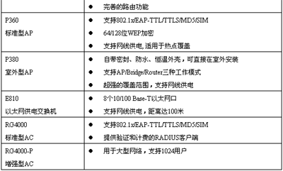 WLAN的應用領域簡單講可以分為三大部分:家庭/Soho應用,行業應用,以及各大電信運營商大力推展的公共熱點覆蓋,這些領域對產品的規格、性能、功能都有相當不同的要求。作為以通信產品的設計和制造為支撐業務的廠商,中達電通向用戶或系統集成商提供全系列的WLAN產品,這其中包括具有時尚造型的家庭型AP WF300,包括ADSL/AP二合一的“無線A貓”WF500,包括用于熱點覆蓋的室內型AP P360、室外型AP P380等等。詳細產品系列如下表所列,其中,除了已經大量商用的11M的IEEE 802.11b產品以外,還包括全系列54M的IEEE 802.11g產品。