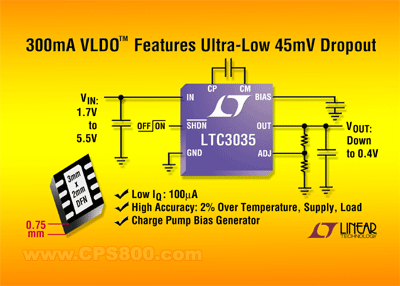 凌特公司推出輸入電壓可低至 1.7V 的300mA 非常低壓差(VLDOTM)線性穩(wěn)壓器 LTC3035。該器件具有低內(nèi)部基準(zhǔn)電壓以及從 0.4V 至 3.6V 的對應(yīng)可調(diào)輸出電壓,而且在滿負(fù)載電流時(shí)保持僅為 45mV 的極低壓差電壓。為允許在低輸入電壓時(shí)工作,LTC3035 帶有一個(gè)集成充電泵轉(zhuǎn)換器,為內(nèi)部 LDO 電路提供必要的空間。這種低輸入電壓能力可從鋰離子電池或 2xAA 堿性電池、低輸入至低輸出電壓轉(zhuǎn)換系統(tǒng)應(yīng)用中實(shí)現(xiàn)高性能。LTC3035 嚴(yán)格的 ±2% 輸出電壓準(zhǔn)確度、分別為 100uA 和 1uA 的低靜態(tài)電流和停機(jī)電流加上快速瞬態(tài)響應(yīng)以及采用很少外部組件的小解決方案占板面積使它非常適用于由電池供電的手持設(shè)備,如具有藍(lán)牙功能的設(shè)備、蜂窩電話、媒體播放器、手持式醫(yī)療和工業(yè)儀表。