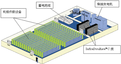InfraStruXure™是一套完整的數據中心電力基礎設施構建方案,它是一個標準化的系統結構,使用標準化的預裝配組件構建數據中心基礎設施,其結合了UPS輸入輸出配電單元(PDU)、SYMMETRA UPS主機、NETSHELTER VX下一代的服務器機柜,完成了配電、UPS、機柜、散熱、電力電纜和數據布線的全套方案。