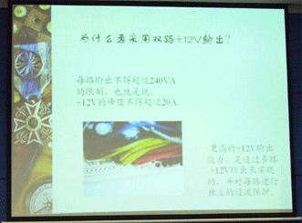 對(duì)于2.0規(guī)范,最后李先生總結(jié)了三個(gè)特征:1. 采用雙路+12V輸出,+12V1給外圍設(shè)備供電,+12V2給CPU供電;2. 采用24PIN電源接口;3. 轉(zhuǎn)換效率提高到80%。
