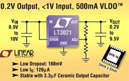 凌特公司(Linear Technology)日前推出電源業界首款500mA非常低壓降穩壓器(VLDO)——LT3021,該器件的輸入電壓低至0.9V,可調輸出電壓低至0.2V。LT3021的低輸入電壓使單節堿性電池和鎳氫金屬電池(1.4V至0.9V)在整個電壓范圍內均可工作。這種低VIN能力對使用1.5V主電源軌的新應用也很重要,這些應用需要1.25V至0.5V的輸出電壓來驅動低壓微處理器和微控制器內核。LT3021在工作電流高達500mA時可保持其160mV壓降,非常適用于要求VIN至VOUT差別小的應用。
