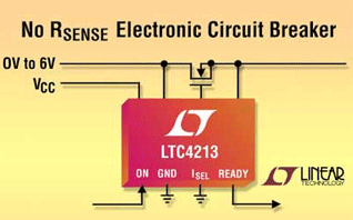 凌特公司(Linear Technology)推出采用外部 MOSFET 的 RDS(ON) 檢測負載電流的電子斷路器 LTC4213,從而去除了對檢測電阻的需求。這種新方法不僅降低了開關通路上的電壓和功率損耗,而且降低了成本并簡化了設計。這尤其有利于低電壓系統,因為檢測電阻電壓降占去了極大部分電源電壓。就超低電壓應用而言,LTC4213 工作在 2.3V 至 6V 的偏置電源電壓范圍,并監視從地到 6V 的電壓。