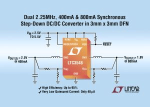 LTC3548適用于需要電流高達(dá)400mA和800mA、高效率以及很小占板面積的雙輸出手持應(yīng)用。LTC3548EDD采用 DFN-10封裝,而LTC3548EMSE采用耐熱增強型MSOP封裝。兩款器件都有現(xiàn)貨供應(yīng),以1,000片為單位批量購買,每片均為2.60美元(僅供參考)。