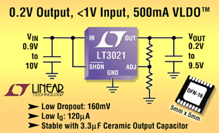 凌特公司(Linear Technology)推出電源業界首款500mA VLDO(非常低壓降穩壓器)LT3021,該器件具有低至 0.9V 的輸入電壓能力和低至 0.2V 的可調輸出電壓。LT3021 的低輸入電壓使單節堿性電池和鎳氫金屬電池(1.4V 至 0.9V)在整個電壓范圍內均可工作。這種低 VIN 能力對使用 1.5V 主電源軌的新應用也很重要,這些應用需要 1.25V 至 0.5V 的輸出電壓來驅動低壓微處理器和微控制器內核。LT3021 在工作電流高達 500mA 時可保持其 160mV 壓降,非常適用于要求 VIN 至 VOUT 差別小的應用。此外,該器件以僅為 120uA 的靜態電流和關機時低于 3uA 的電流提供微功率工作,最大限度地延長了手持應用的工作時間。
