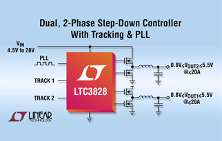 凌特公司(Linear Technology)推出雙輸出降壓型同步開關(guān)控制器 LTC3828,該器件具有用于多電壓軌排序的集成跟蹤功能以及用于精確同步和多相(PolyPhase®)工作以降低輸入電容的鎖相環(huán)(PLL)。LTC3828 具有獨特的能力,能以菊花鏈方式鏈接多個 LTC3828 或其它 DC/DC 轉(zhuǎn)換器,以跟蹤兩個以上的電壓,同時工作在 3、4 或 6 相。該集成電路具有恒定的 550kHz 頻率電流模式架構(gòu),還能鎖定到 260kHz 至 550kHz 的時鐘上以降低敏感頻率上的 EMI。