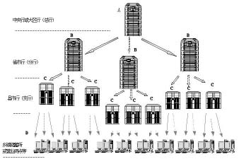 為了管理的方便,按照銀行系統一般的劃分是:總行——分行——支行——分理處儲蓄所或營業點。當然有些在名稱上有所不同,或在層次上有所增減。其劃分情況如上圖所示。