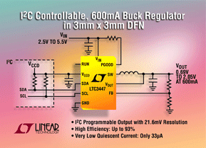 LTC3447 同步降壓型穩壓器能以高達 93% 的效率提供高達 600mA 的輸出電流。其 I2C 接口頻率可以設置到標準的 100kHz 或 400kHz“快速模式”,同時輸出電壓能以 21.6 mV 的分辨率編程。恒定 1.0MHz 開關頻率確保低噪聲并允許使用微小的表面貼裝電感器和電容器。延長電池壽命的自動突發模式(Burst Mode®)工作將輕負載電源電流降低至僅為 33uA,而在關斷時更降低至 1uA。就低噪聲應用而言,突發模式功能可以禁止。其它特點包括軟啟動和啟動電源良好(Power Good)消隱。