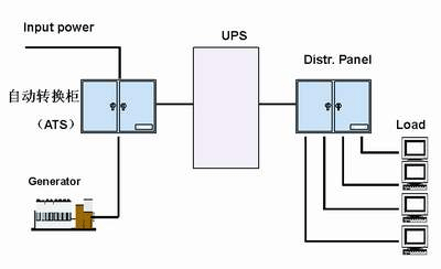 在UPS與發電機匹配使用中,只需為UPS配置少量后備電池以備切換時使用。發電機與市電轉換即可以手動,也可以設置自動切換設備(ATS)。當市電出現故障,自動切換設備(ATS)將自動切換到發電機端,發電機經過一定的時間延遲(可根據客戶需要設定時間)自動啟動,提供電力保障。