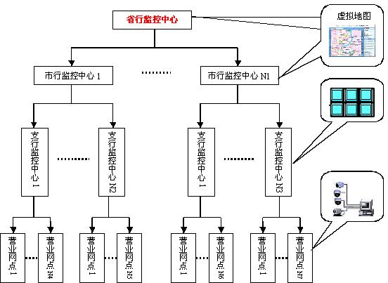 依據本地存儲, 分級控制,集中管理的原則,將系統所有營業機構組成一個整體的數字化監控網絡。從局部看,每個營業機構獨立使用一套監控系統主機,構成一個獨立的運行終端,單獨完成各自采集到的音視頻信號的顯示、壓縮、存儲、回放等功能;而從整體看,這些眾多的相互獨立的運行終端,通過各自的網絡連接設備,有機連接為一個完整的數字化網絡監控系統。上級管理人員通過這個監控網絡即可隨時調看各營業機構監控設備的運行和現場情況,從而真正實現了管理的網絡化和智能化。整個系統采取分級管理模式,各級均具有權限控制功能。省分行作為系統的最高級控制中心,具有最高訪問權限,通過設在省分行監控中心控制主機上的虛擬電子地圖,可以隨時調看全省各營業機構監控設備的運行和現場情況,還可以查詢各點的歷史記錄,當有報警信號上傳至控制中心時,中心可以立即將畫面切換至該報警點以便快速采取應對措施;支行作為各營業機構的基本管理部門,其管理職能較為綜合和重要,每一支行的監控中心均設有大屏幕監控,實時對所轄營業網點監控;儲蓄點與分理處屬于信息采集終端,以錄像和監控報警為主。