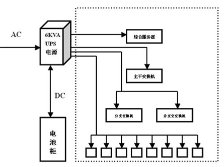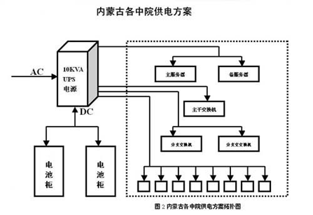 結合以上用戶的實際情況,我們為內蒙古高級人民法院制定了一個高可靠電源保護整體解決方案: 為每一個中院配備科士達Master系列 10KVA延時4小時UPS,每一個基層法院我們選配了科士達GP800系列 6KVA工頻在線式 延時4小時UPS。其配電拓撲圖如圖2和圖3所示
