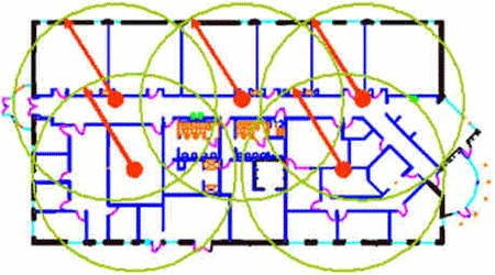 設計方案一般根據經驗確定單天線覆蓋半徑,估計覆蓋范圍,功率設計難度很大。設計結果和覆蓋效果可以參看以下二圖。