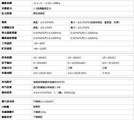 該產品采用衛生型的壓阻式OEM壓力傳感器作為信號測量元件,并經過計算機自動測試,用激光調阻工藝進行了寬溫度范圍的零點和靈敏度溫度補償。放大電路位于不銹鋼殼體內,將傳感器信號轉換為標準輸出信號。整個產品經過了傳感器、元器件、半成品及成品的嚴格測試及老化篩選,性能穩定可靠。