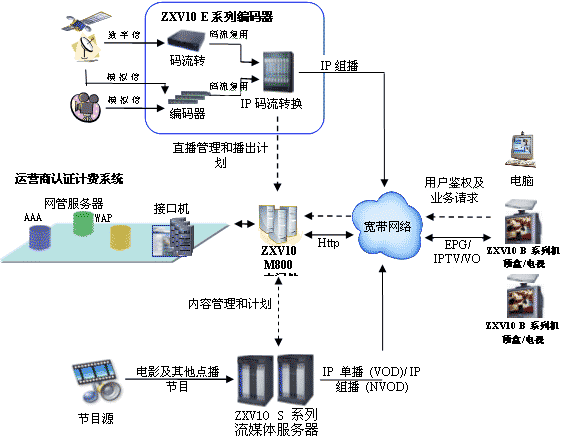 ZXV10系統主要由中間件、流服務器、內容處理設備、STB及網絡平臺組成。