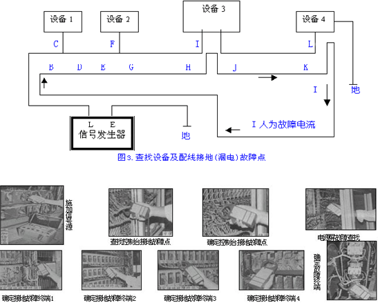 信號發送器輸出可施加于短路電源兩端.人為故障電流一定而且必須經過短路點.用信號接收器按圖對單根配線進行接收,對每根有電平指示的配線,根據設備配線圖確認屬于電源正或負的線點,這樣,正負電源線點的交分處即為設備及配線短路故障點.