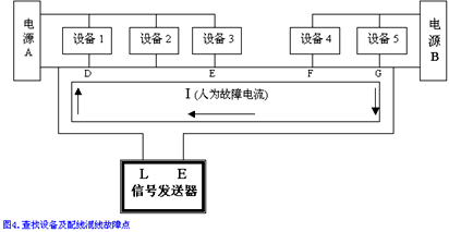 信號發送器輸出可施加于混線電源兩端DG之間.人為故障電流一定而且必須經過混線點.用信號接收器按圖對單根配線進行接收,對每根有電平指示的配線,根據設備配線圖確認屬于那個電源的線點,這樣,兩電源線點E與F的交分處C即為設備及配線混線故障點.