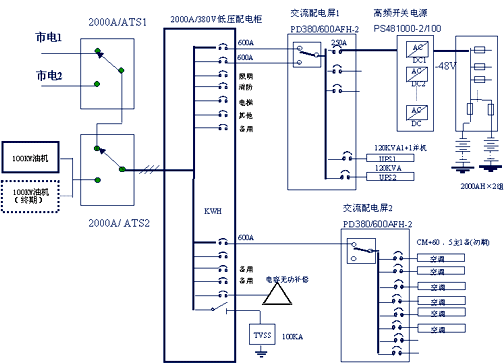 圖一是一個典型的 5萬門以上的大型交換局供電方案原理圖。整個動力系統初期由兩路市電、一路油機輸入(終期可擴展為兩臺油機),經過高性能的ATS自動切換開關選擇一路供電輸入低壓配電柜,低壓配電母線上加裝了TVSS抗浪涌裝置和無功補償柜。電能由低壓配電柜分配給下一級的交流配電屏以及電梯、消防、水泵和照明等其他用電。給通信設備供電的直流不間斷電源和交流不間斷電源有專用的交流配電柜,直流電源采用N+1備份的智能高頻開關電源系統,交流部分采用兩臺UPS 1+1直接并聯的冗余方式,對于此類重要的局站,電池也建議采用1+1備份的方式。通信機房和電力(電池)室的空調也應采用恒溫、恒濕的機房專用精密空調,為設備的可靠運行提供良好的環境保障,為了防止空調啟動浪涌對UPS及直流電源的干擾,空調的供電也由電力室的專用交流配電屏進行配送。