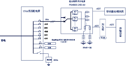傳輸、接入網類局站通常規模較小、重要程度也較前兩類低,電源系統的要求不可用度不大于 5×10-6,即平均20年時間內,每個電源系統故障的累計時間應不大于50分鐘。 對于此類局站,由于功能單一、規模小,通信和動力設備一般都置于同一房間,其動力配置在網絡能源一體化的解決方案中是規模最小、配置最簡單的一種。如圖可見,此類局站一般僅為一路市電輸入,也不配置油機,只經過一級低壓配電便分配到電源及空調設備,電池的配置也是采用容量一分為二的方式。但是由于機房空間有限,對電源系統的體積、重量、安裝形式會有特殊的需要。有些需要將蓄電池集成到電源系統機架內;有些需要靠墻放置;甚至可能需要壁掛式安裝。此外,此類局站一般不必進行無功補償。