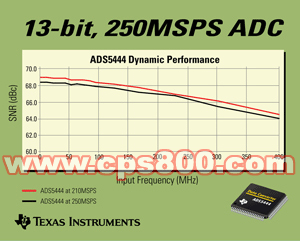 TI負責高速ADC業務的經理Roberto Sadkowski指出:“ADS5444成功擴展了領先的ADS5440 13位210MSPS ADC的SNR與SFDR性能,擁有更高的輸入頻率。”
