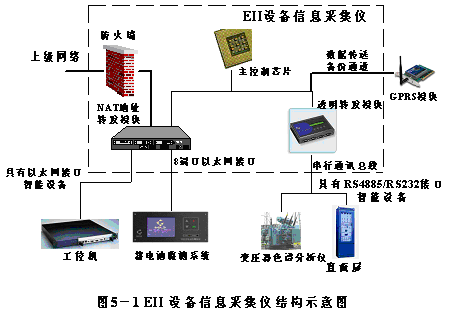 設(shè)備運行狀態(tài)信息采集儀采用32位嵌入式系統(tǒng)作為主數(shù)據(jù)處理器,采用Intel公司的網(wǎng)絡(luò)芯片處理100M以太網(wǎng)信息。設(shè)備為用戶預(yù)留一路GPRS無線網(wǎng)絡(luò)傳輸通道,以便在100M以太網(wǎng)絡(luò)發(fā)生故障時,提供連續(xù)不間斷的連接。串行通訊總線可最多連接8個智能設(shè)備。協(xié)議透明轉(zhuǎn)發(fā)模塊是獨立負責從數(shù)據(jù)采集平臺接收命令,同時向該平臺回送智能設(shè)備返回信息,另外還包括配置各設(shè)備通訊基本信息。內(nèi)置的NAT防火墻對上級網(wǎng)絡(luò)的信息進行過濾,NAT地址轉(zhuǎn)發(fā)模塊能自動對具有以太網(wǎng)接口智能設(shè)備進行IP地址分配,解決IP地址占用的問題。用戶可通過EII設(shè)備內(nèi)置WEB服務(wù),對設(shè)備進行參數(shù)配置和管理。