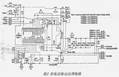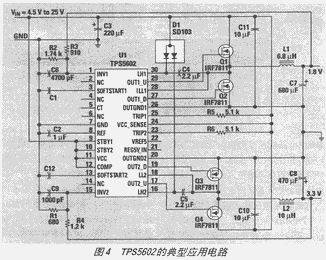 圖4是采用TPS5602的典型應用電路。該電路包括一個輸出電壓為1.8V和3.3V的雙通道同步降壓轉換器。兩個輸出電壓不僅互不依賴,而且可通過取樣電阻(如R1、R2、R3和R4)調整它們的輸出范圍(大約在輸入電壓和1.2V之間)。輸出電壓OUT1和OUT2的方程式如下,其中參考電壓為1.185V。