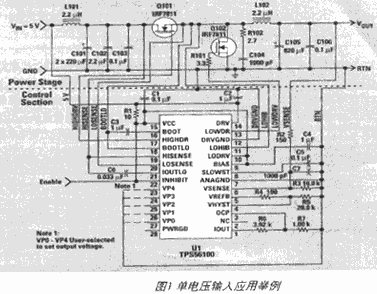 TPS56100是一款開關模式的同步降壓電源控制器,能提供精確的可編程電壓輸出,適合5V單電源供電的微處理器應用。1.3V~2.6V的參考電壓來源于可編程電壓引腳(VP)。通過VP引腳可將輸出電壓設置成等同于參考電壓,或者通過采樣電阻(R2,R3)(見圖1)將輸出電壓設置成參考電壓的倍數。TSP56100還具有一個輸入禁止引腳來控制上電順序和低電壓禁止,從而保證在啟動控制器之前,電源輸出沒有偏差。