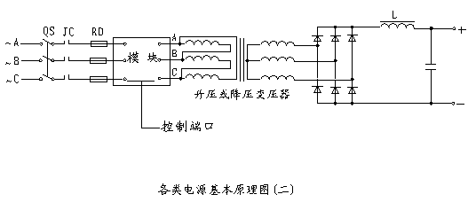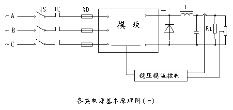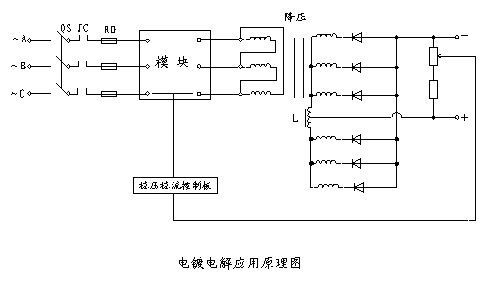 電路說(shuō)明:通過(guò)晶閘管智能控制模塊控制變壓器初級(jí)電壓,變壓器次級(jí)接雙反星形(二極管)整流電路,變壓器次級(jí)兩個(gè)星點(diǎn)之間接一平衡電抗器L。通過(guò)穩(wěn)壓或穩(wěn)流控制板形成閉環(huán)控制,達(dá)到電壓或電流的穩(wěn)定輸出。