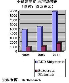 高亮度LED的出貨量2005年達到48億個,預計2006年上升至65億個,2011年達到88億個,AAGR為10.3%。2005年LED的基板材料銷售額超過10億美元,2006預計達到11億美元,2011年突破18億美元,AAGR為9.7%。