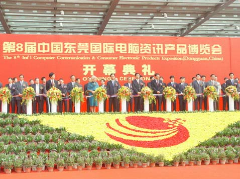 10月17日,第八屆中國東莞國際電腦資訊產(chǎn)品博覽會(huì)在東莞國際會(huì)展中心隆重揭幕。省委副書記歐廣源、省人大常委會(huì)副主任李近維、市委書記、市人大常委會(huì)主任劉志庚、市長李毓全,以及東莞市五套班子領(lǐng)導(dǎo)、兩岸三地電子行業(yè)協(xié)會(huì)的負(fù)責(zé)人等2000多人出席了開幕式。