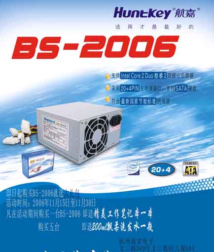 Intel酷睿2處理器已全面成為市場主流,近期航嘉針對新平臺推出了一款雙核電源,型號為BS-2006,包裝上醒目的指出支持酷睿2 CPU,并且價格僅為130元,成為目前市場上支持酷睿平臺最低價的電源。