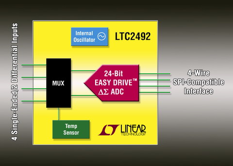 凌力爾特日前推出 4 通道增量累加模數(shù)轉(zhuǎn)換器(ADC)LTC2492,該器件在纖巧的 4mm x 3mm DFN 封裝中集成了一個溫度傳感器和一個新穎的前端設(shè)計。LTC2492 的 Easy DriveTM 設(shè)計產(chǎn)生的平均差分輸入電流為零,因此無需內(nèi)部緩沖器就可測量高阻抗輸入電源。這個已獲專利的采樣電路簡化了前端信號調(diào)節(jié)電路的設(shè)計,并允許直接用電橋、RTD、熱電耦和高阻抗傳感器驅(qū)動該 ADC。軌至軌輸入信號可以直接數(shù)字化,同時保持卓越的 DC 準確度(2ppm INL)。