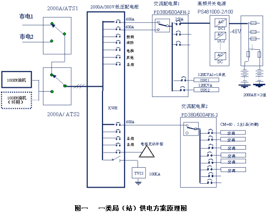 一類局(站)通常為省會(huì)城市和大區(qū)中心通信綜合樞紐(含國際局)、市話匯接局、電報(bào)(數(shù)據(jù))局、無線局、長途傳輸一級(jí)干線站、市話端局以及特別規(guī)定的其它通信局(站),在通信網(wǎng)絡(luò)中地位最重要,職能也最完整,因此對(duì)動(dòng)力機(jī)房的配置要求也是最高的,它要求電源系統(tǒng)的不可用度不大于5×10-7,即平均20年時(shí)間內(nèi),每個(gè)電源系統(tǒng)故障的累計(jì)時(shí)間應(yīng)不大于5分鐘。電源系統(tǒng)的可靠性除了通過電能變換設(shè)備自身的性能及冗余配置來保障,還依賴于多路電源的輸入、可靠的切換機(jī)構(gòu)和低壓配電系統(tǒng)的合理設(shè)計(jì)來共同完成。