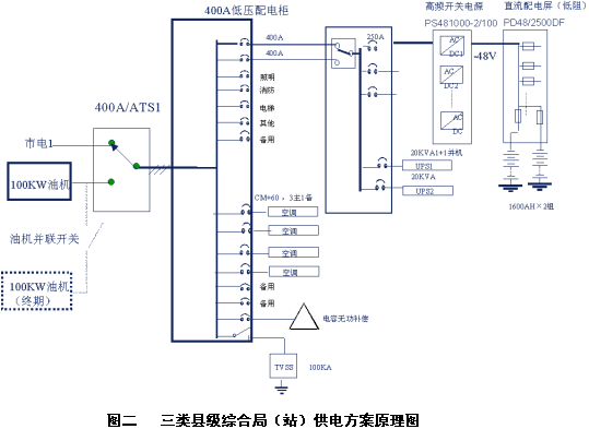 二類局(站)通常為地市級(jí)城市綜合局、1~5萬門市話局、長途傳輸二級(jí)干線站或相當(dāng)?shù)耐ㄐ啪郑ㄕ荆┑龋诼毮苌吓c一類局站類似,所需設(shè)備種類及配套機(jī)房也類似,但是規(guī)模較前者小,重要程度也相對(duì)低一些,此類局站電源系統(tǒng)的不可用度應(yīng)不大于1×10-6。即平均20年時(shí)間內(nèi),每個(gè)電源系統(tǒng)故障的累計(jì)時(shí)間應(yīng)不大于10分鐘。二類局(站)的供電方案與一類局站基本相同,只是在設(shè)備的容量上根據(jù)負(fù)載需求會(huì)有一定差別。