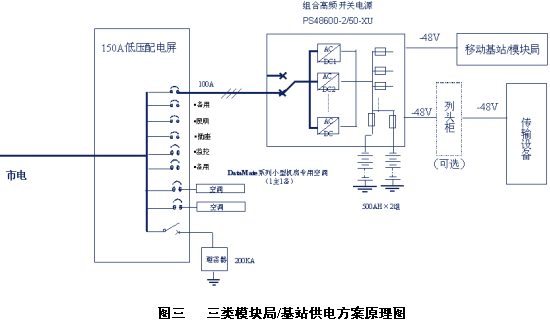 對(duì)于三類局站中的模塊局、移動(dòng)基站等機(jī)房,由于功能單一、規(guī)模小,通信和動(dòng)力設(shè)備一般都置于同一房間,其動(dòng)力配置在網(wǎng)絡(luò)能源一體化的解決方案中是規(guī)模最小、配置最簡單的一種。如圖三可見,此類局站一般僅為一路市電輸入,也不配置油機(jī),只經(jīng)過一級(jí)低壓配電便分配到電源及空調(diào)設(shè)備,電池的配置也是采用容量一分為二的方式。此外,此類局站一般不必進(jìn)行無功補(bǔ)償。