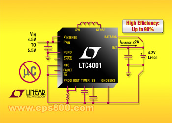 凌特公司推出能提供 2A 電流的高效率開關模式電池充電器 LTC4001,該器件用于單節 4.2V 鋰離子/鋰聚合物電池,可在不損失電路板空間的前提下最大限度地降低熱耗散。獨立工作無需外部微處理器實現充電終止。就安全和自主充電控制而言,LTC4001 具有自主停機、電池預查驗、熱敏電阻輸入以實現合格溫度的充電、遠程檢測、充電結束指示和可編程充電終止定時器等特點。該器件為使用 5V 墻上適配器輸入電源而設計,適用于手持醫療設備、手持計算機、充電座、數字相機以及智能電話應用。它還可與限流墻上適配器一起使用,以進一步降低功耗。