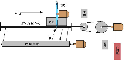 主軸電機用VFD-015M23A驅動,切臺上的圓刀(切刀)用VFD-007M23A驅動,伺服與齒輪同軸相連,通過齒輪皮帶帶動導軌,使切臺在如圖中A所示方向來回移動,用來完成定長的操作。同時切臺通過油壓可以在如圖中B所示方向前后移動,用來對套在主軸上的膠帶進行切割。